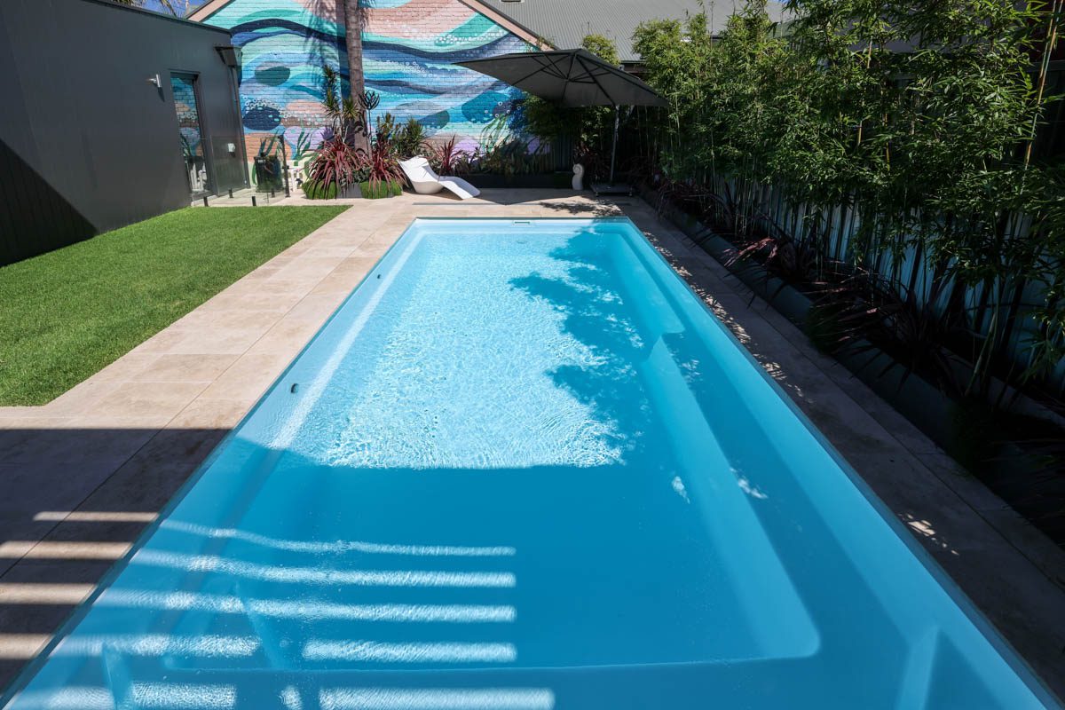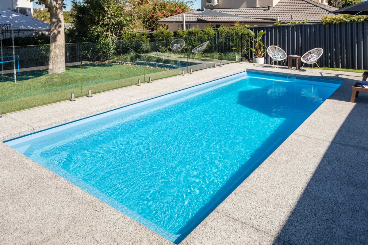 Generous seating across one end of the fibreglass in-ground swimming pool and halfway along one side makes a great conversation corner whilst sitting in clear cool water on hot sunny days.