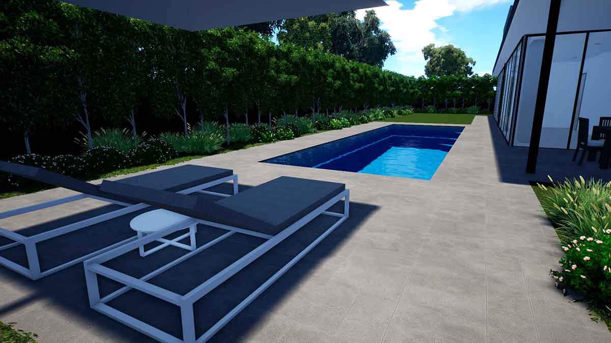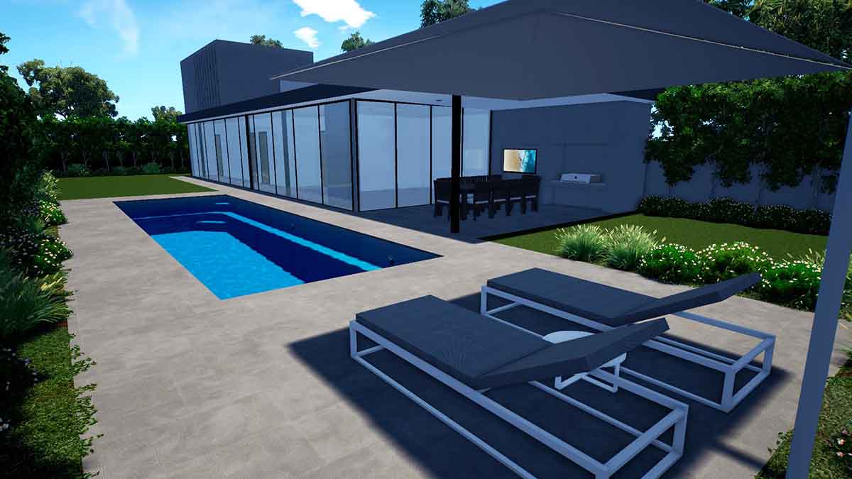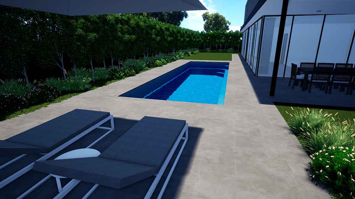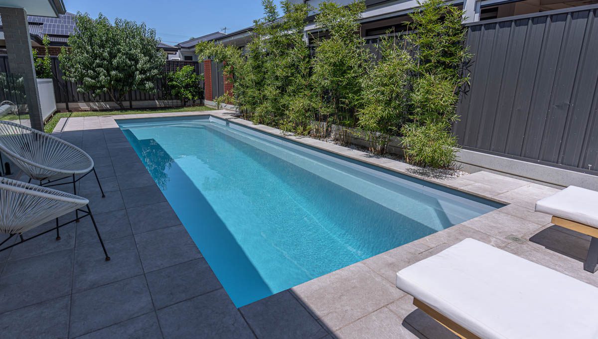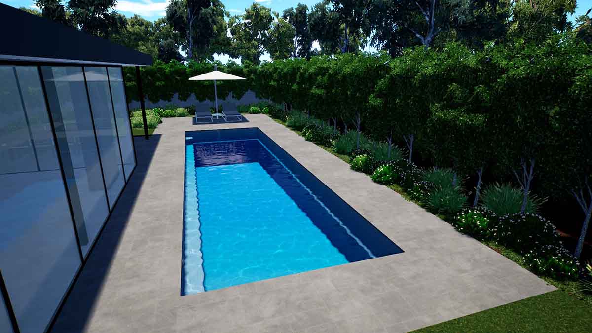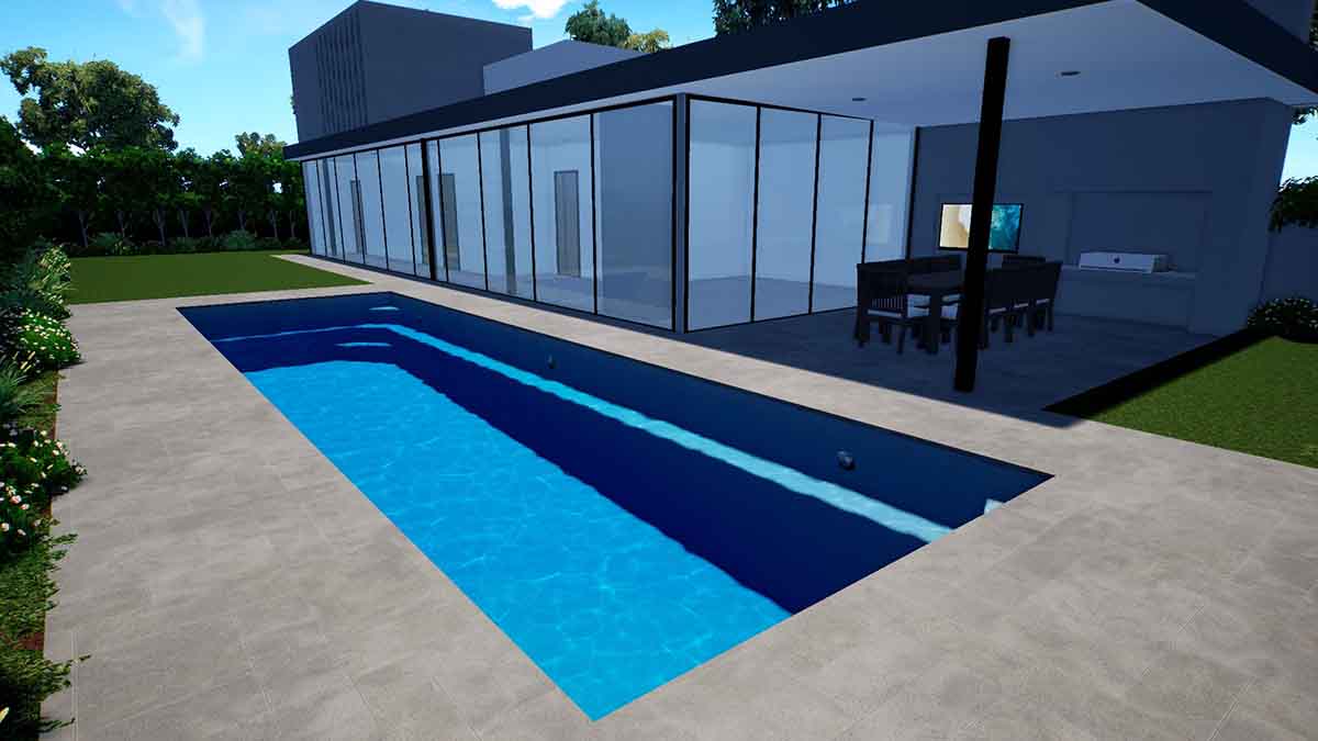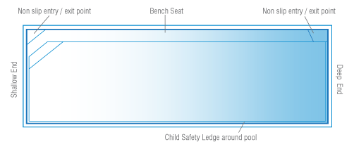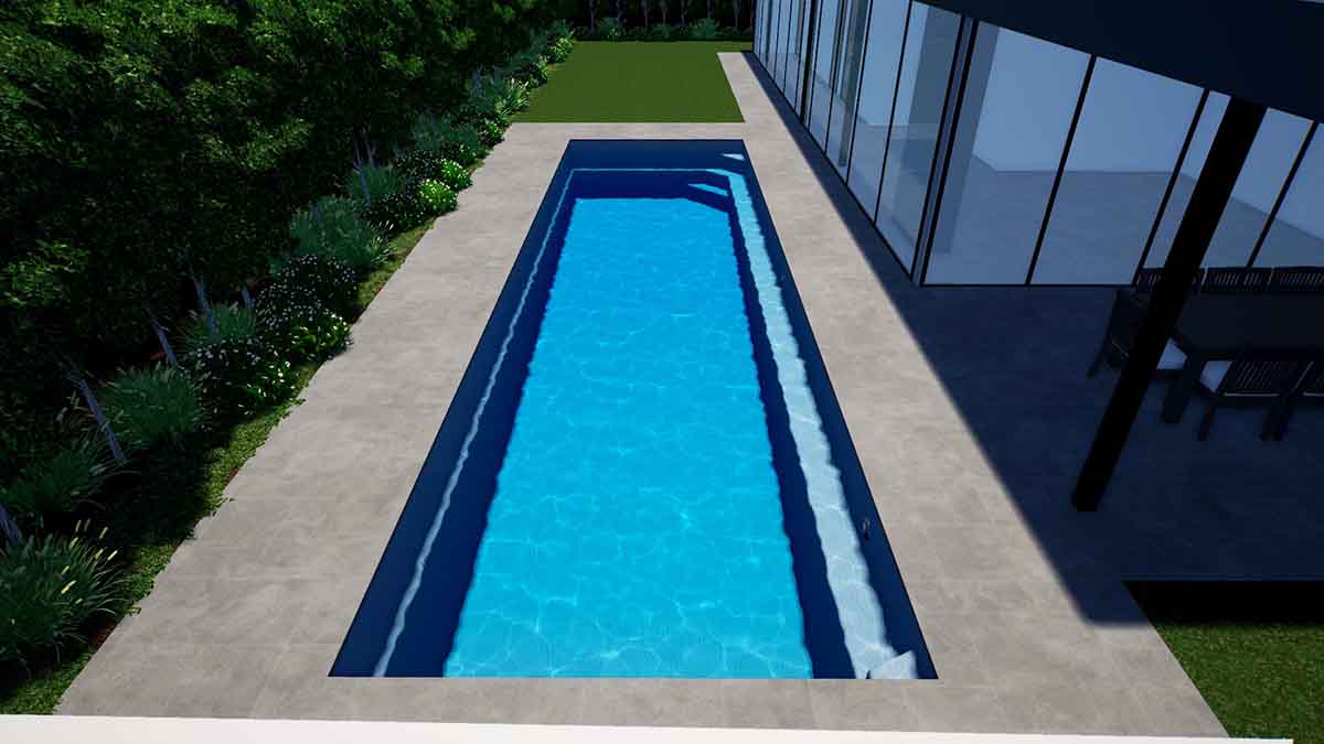 The Brampton Lap Pool has bench seating running the full length of the pool which helps on its close proximity to houses and structures close by. The sleek design provides an unobstructed swim area that creates a spacious feel and the perfect family pool.