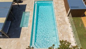 The Brampton Lap Pool has bench seating running the full length of the pool which helps on its close proximity to houses and structures close by. The sleek design provides an unobstructed swim area that creates a spacious feel and the perfect family pool.
