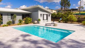 Introducing the Brampton 10.1m x 4.4m pool in Royal Alpine White Shimmer, showcasing striking geometric features that beautifully complement both modern and timeless landscapes.