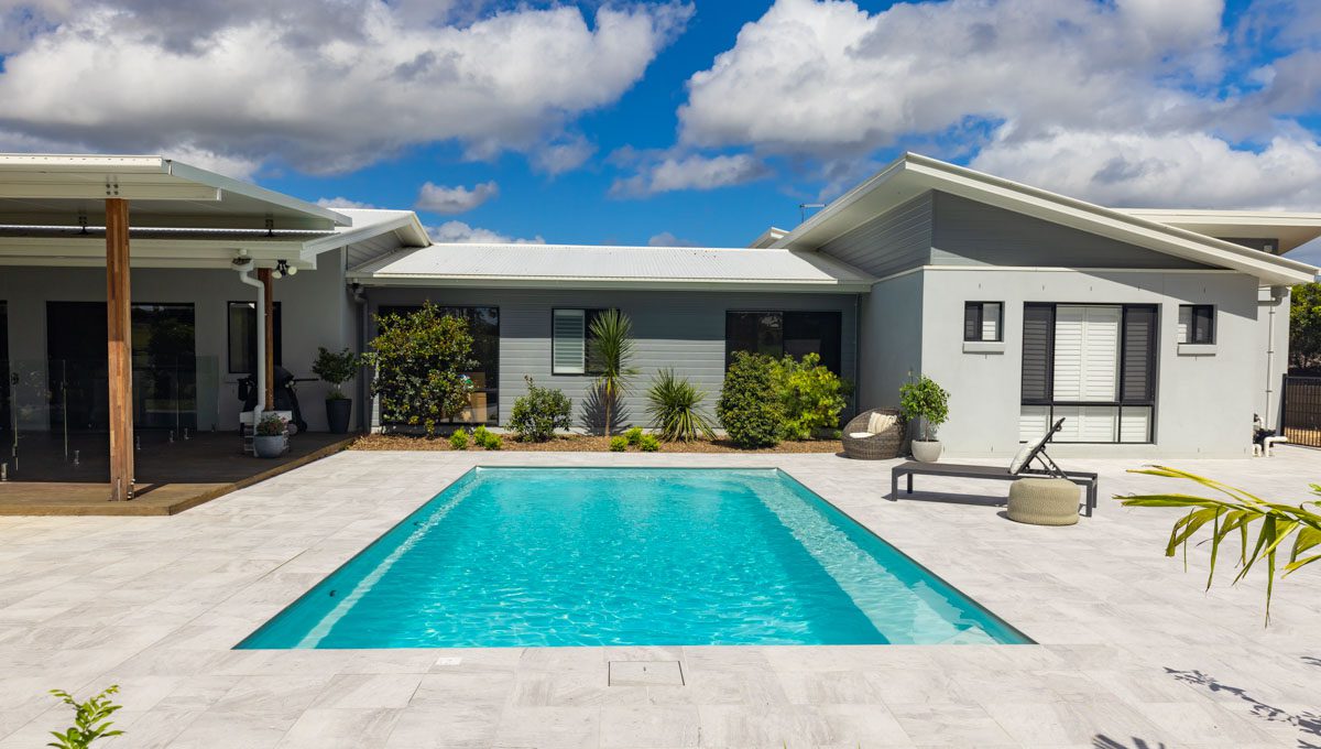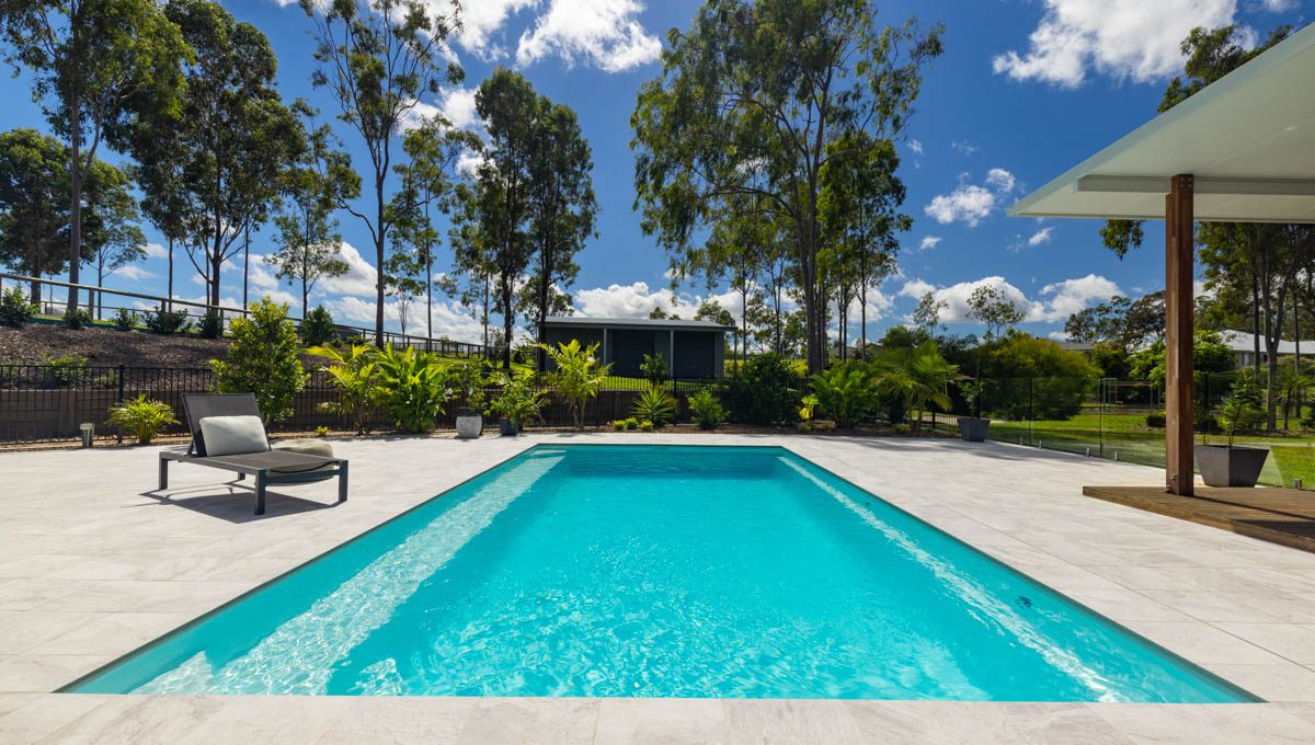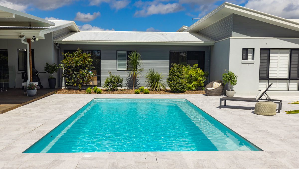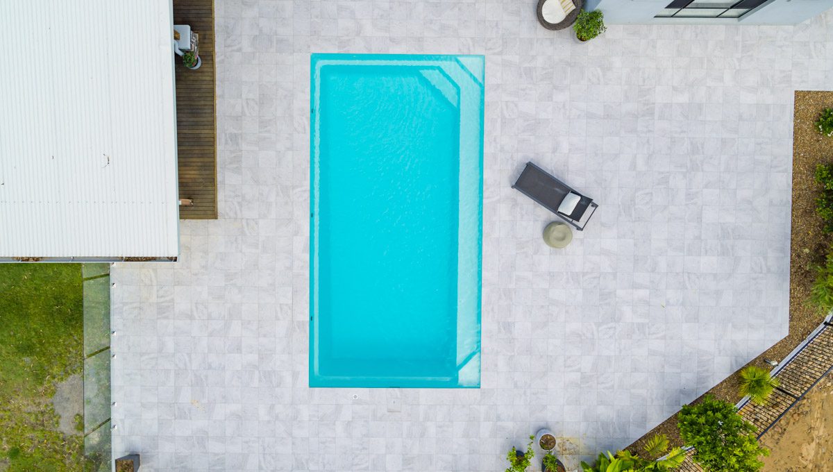 Introducing the Brampton 10.1m x 4.4m pool in Royal Alpine White Shimmer, showcasing striking geometric features that beautifully complement both modern and timeless landscapes.