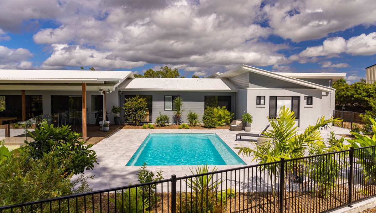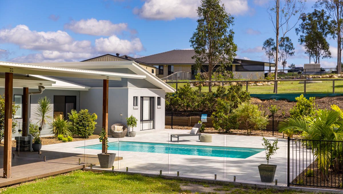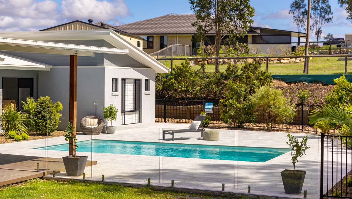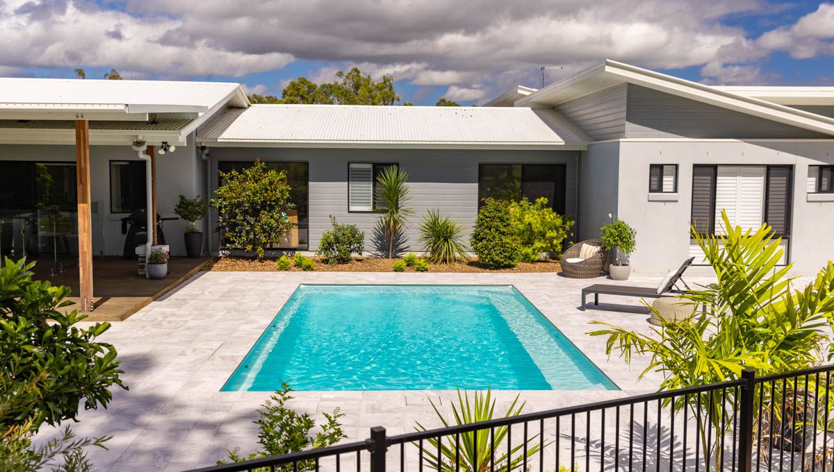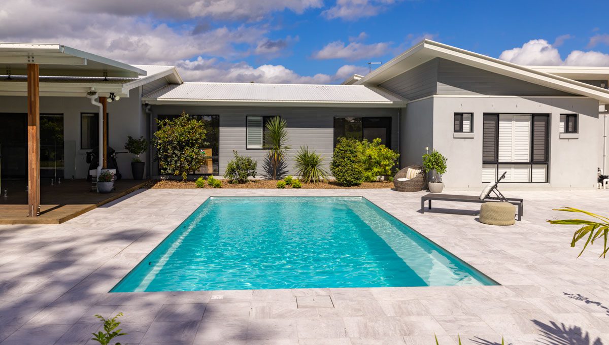Introducing the Brampton 10.1m x 4.4m pool in Royal Alpine White Shimmer, showcasing striking geometric features that beautifully complement both modern and timeless landscapes.